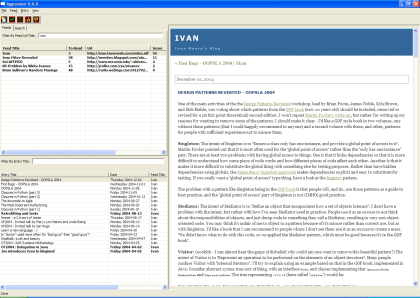Aggrevator is a cross-platform RSS/Atom aggregator that uses a MySQL 4.1 database for storage. It is designed to make life easier for people who want to subscribe to large numbers of blogs by using scoring, sophisticated search, filtering and sorting.